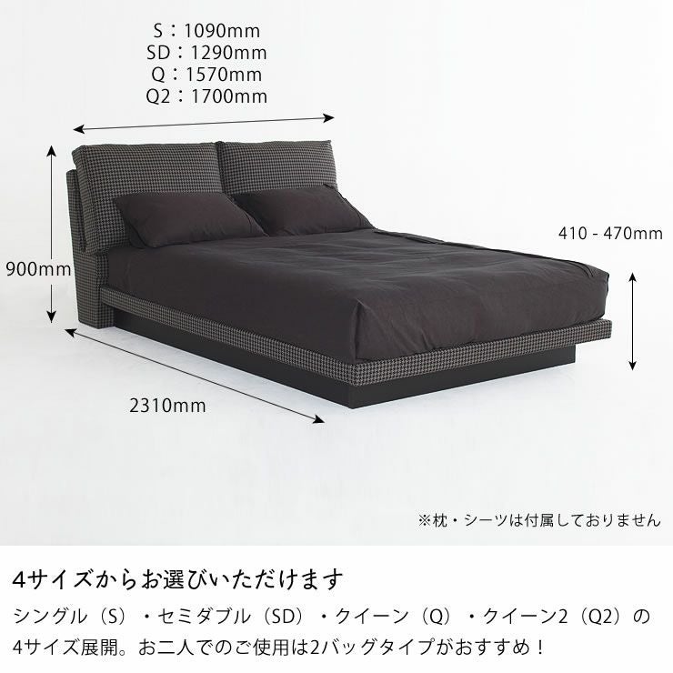 シングル(S)・セミダブル(SD)・クイーン(Q)・クイーン2(Q2)の4サイズ展開。お二人でのご使用は2バッグタイプがおすすめ!