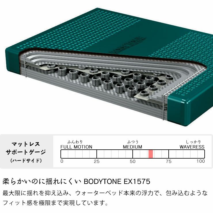 しっかりしたサポート感の中にも水の感触をしっかり味わいたいウォーターベッドファンに人気のマットレスです。最大限に揺れを抑え込み、ウォーターベッド本来の浮力で、包み込むようなフィット感を極限まで実現しています。