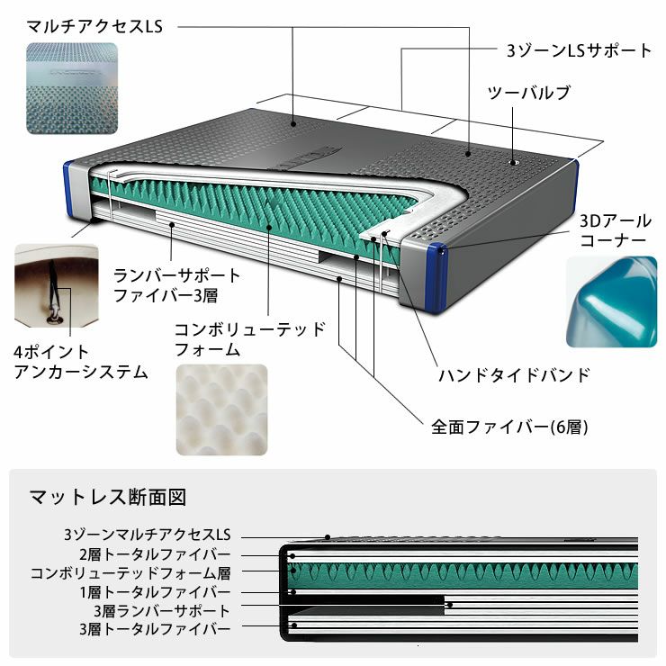 四つ角にアンカーシステムを設け、ファイバーのポジションをしっかり固定。長時間寝心地を変えることなく効果を持続させます。