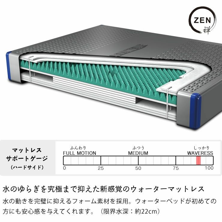 水の動きを完璧に抑えるフォーム素材を採用。ウォーターベッドが初めての方にも安心感を与えてくれます。(限界水深:約22cm)